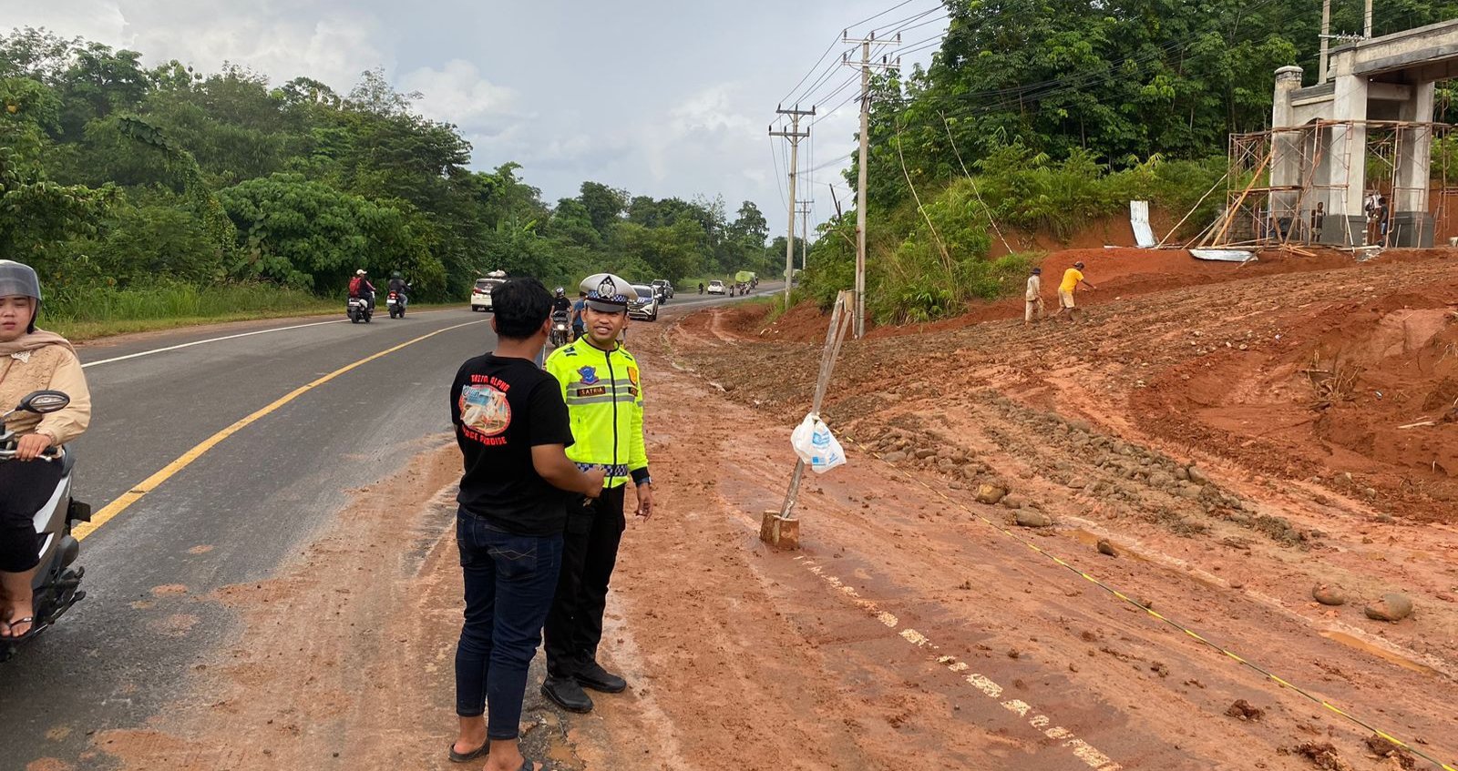 Satlantas Polres Musi Rawas (Mura), melihat kondisi Jalan Lintas Sumatera (Jalinsum), tepatnya didepan proses Pembangunan Pendopoan Rumah Dinas Bupati Mura, licin akibat jatuhnya tanah dan material yang jatuh kebadan jalan.